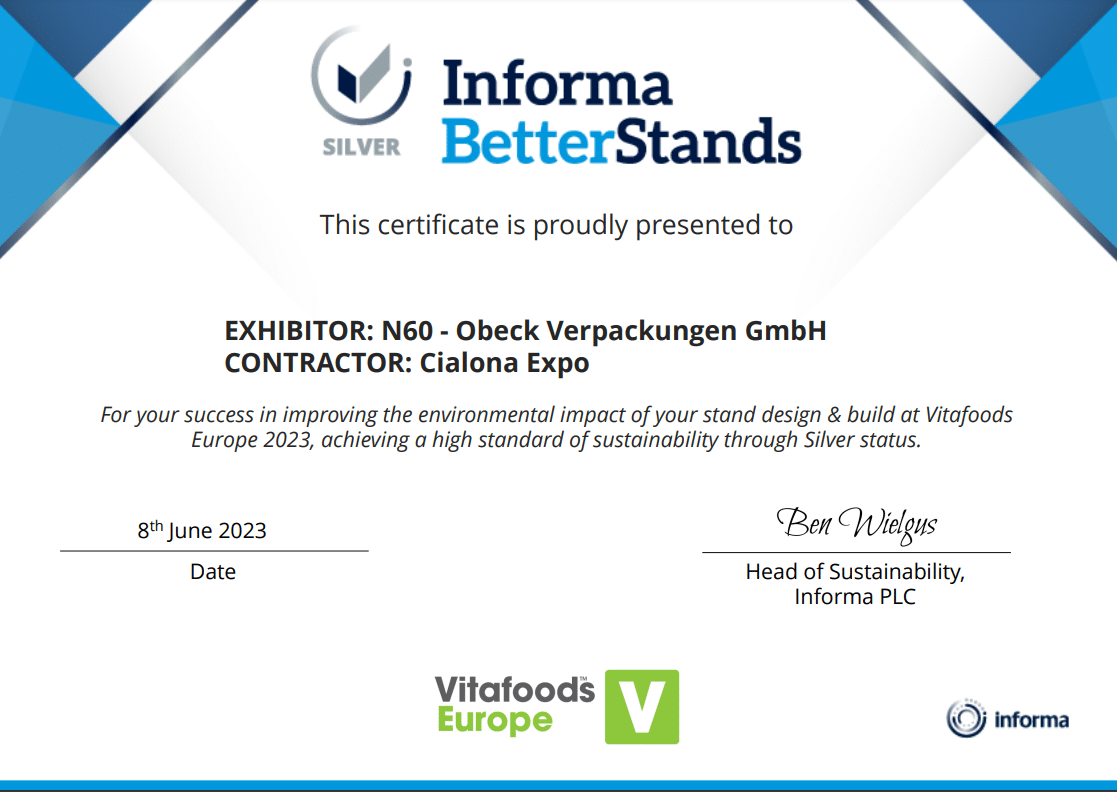 De beursstand die wij voor Obeck Verpackungen GmbH hebben ontwikkeld, heeft het zilveren certificaat behaald.