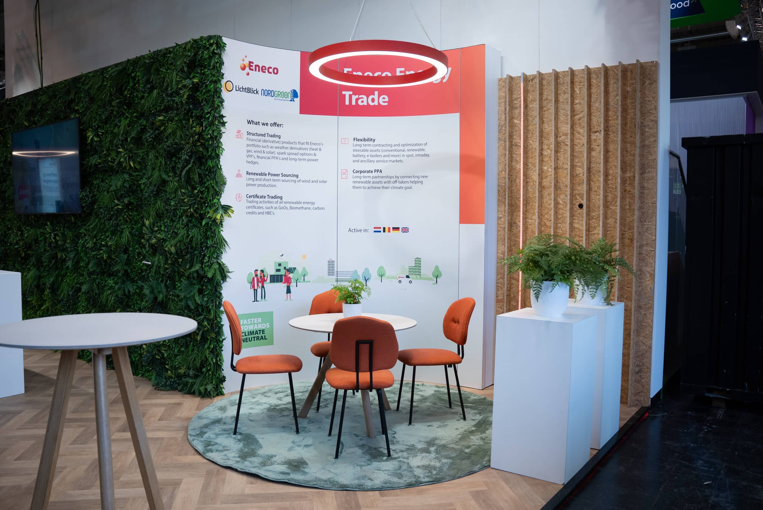 Met een opvallende groene structuur en duidelijke branding wist Eneco zich duidelijk te onderscheiden op de beursvloer van de energiebeurs.