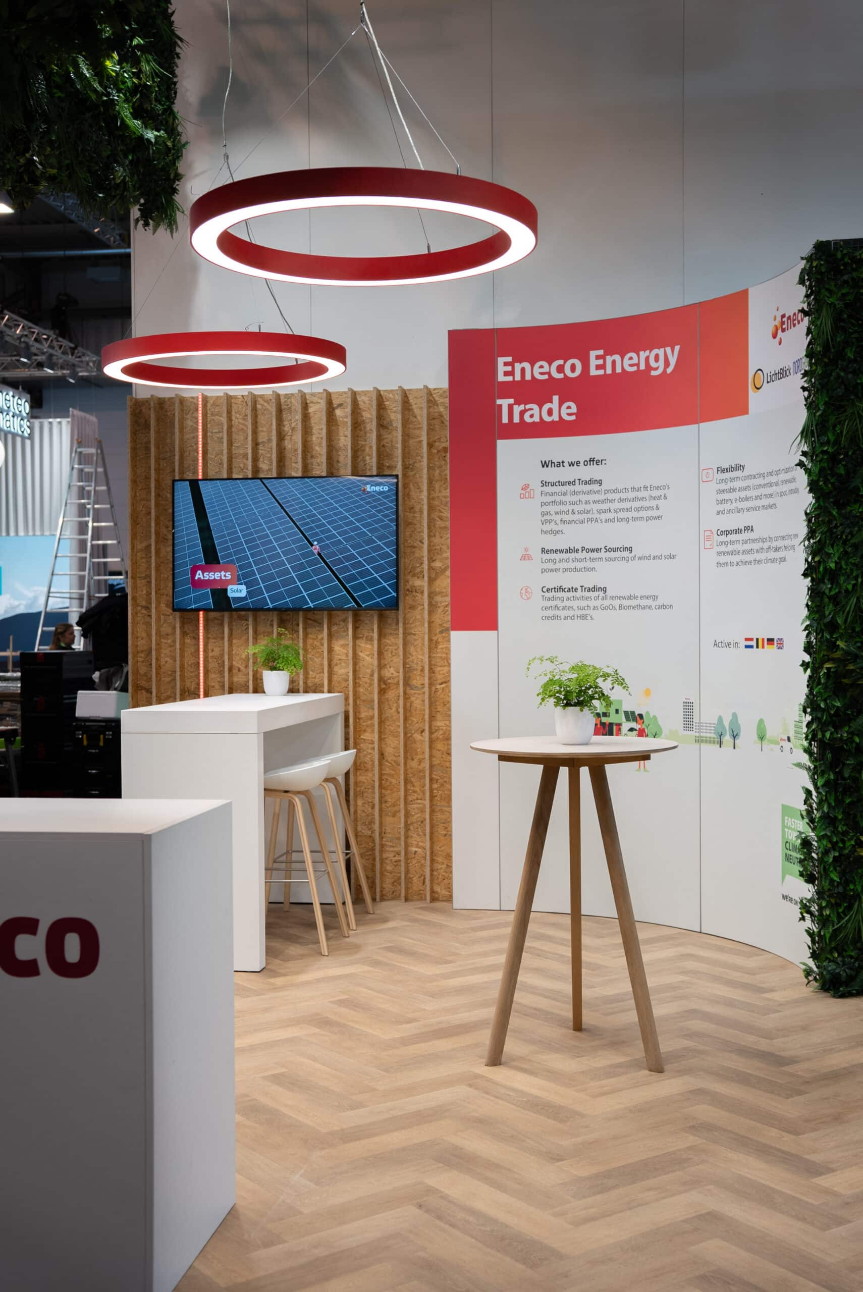 De geïntegreerde verlichte Eneco-logo’s versterkten de zichtbaarheid op de beursvloer en zorgden voor een sterke merkpresentatie. De groene, duurzame uitstraling sloot bovendien perfect aan bij het verhaal van Eneco: het versnellen van de energietransitie.